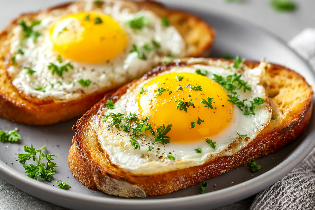 Large eggs work best. Crack one directly into the center of each toast pocket. Fresher eggs hold their shape better.