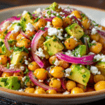 Chickpea Feta Avocado Salad is a vibrant, wholesome dish packed with creamy avocado, tangy feta, hearty chickpeas, and crisp veggies — all tossed in a zesty lemon-garlic dressing. It’s the perfect balance of textures and flavors: soft and crunchy, creamy and bright, salty and citrusy.