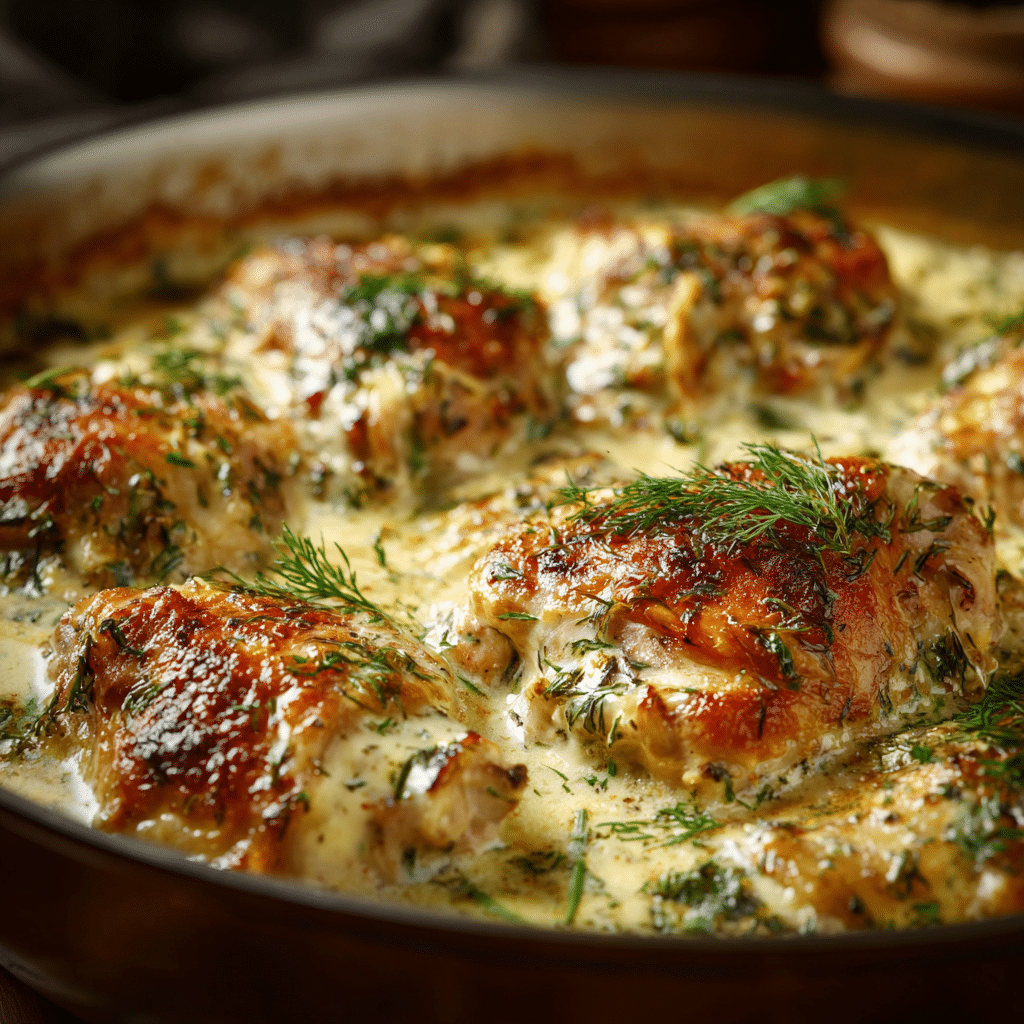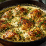 Tender, crispy-skinned chicken thighs baked in a rich, garlicky cream sauce with Parmesan and herbs. A comforting, one-pan dinner that’s both simple and elegant.