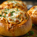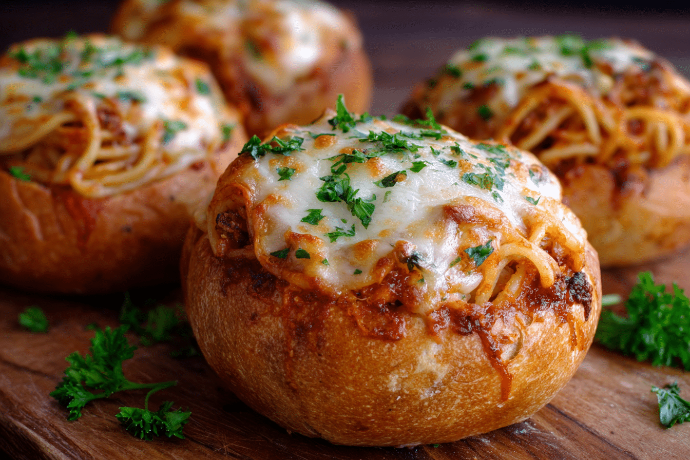 Crunchy garlic bread bowls filled with saucy spaghetti and melted cheese — the ultimate comfort food fusion, perfect for using up leftovers or creating a fun twist on pasta night.