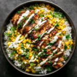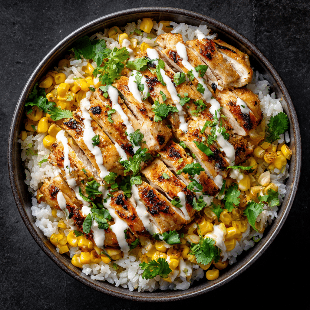 This Easy Street Corn Chicken Rice Bowl combines juicy seasoned chicken, charred corn, and creamy chili-lime sauce over fluffy cilantro rice — a perfect weeknight meal ready in 30 minutes!