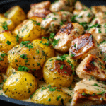 Golden-seared chicken smothered in a high-protein creamy garlic sauce, served alongside crispy roasted potatoes for a rich, balanced, and satisfying one-pan meal.