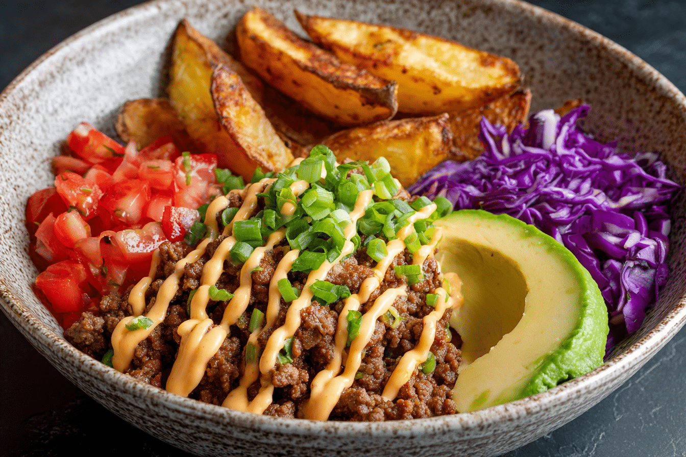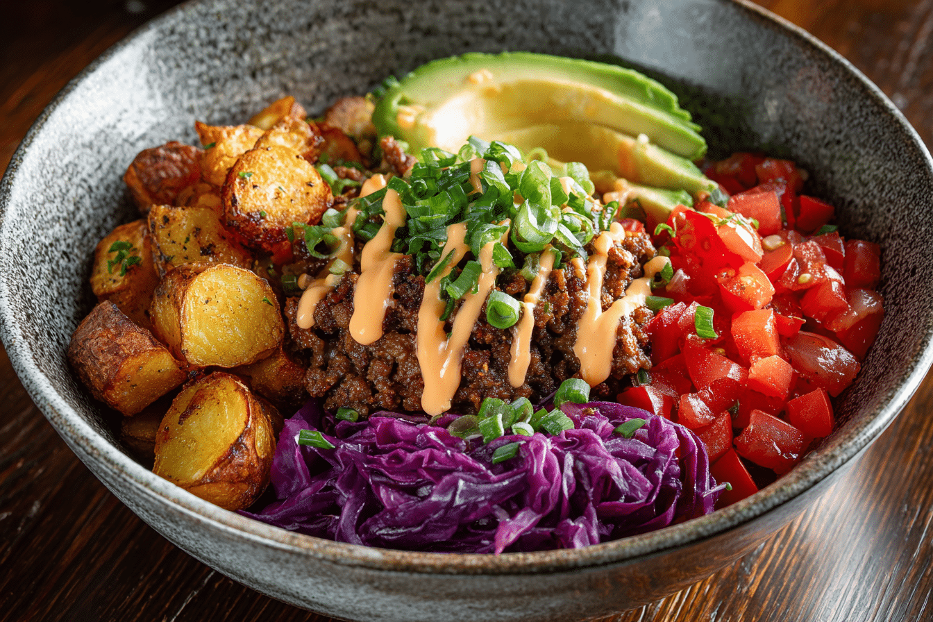Paleo Burger Bowls with Fries are packed with protein, fiber, and healthy fats without relying on grains, dairy, or processed condiments. Ground beef provides iron and B vitamins, while sweet potatoes add complex carbs and potassium.