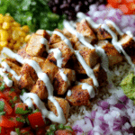 This bowl is light but filling, customizable, and meal-prep friendly. Juicy, spiced chicken pairs with fluffy cauliflower rice or brown rice, crisp lettuce, sweet corn, black beans, and fresh salsa. You’ll get all the bold flavor and texture of a loaded burrito—no tortilla needed.
