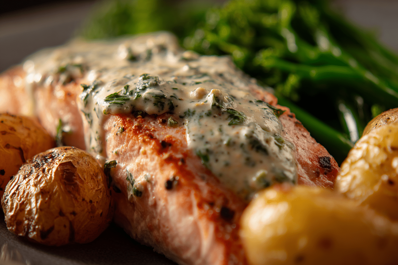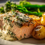 Juicy, flaky salmon fillets are oven-roasted to perfection alongside seasonal vegetables, then drizzled with a silky lemon butter sauce that adds brightness and depth. It’s a complete one-pan meal that delivers balanced nutrition, minimal cleanup, and serious flavor — all in under 30 minutes.