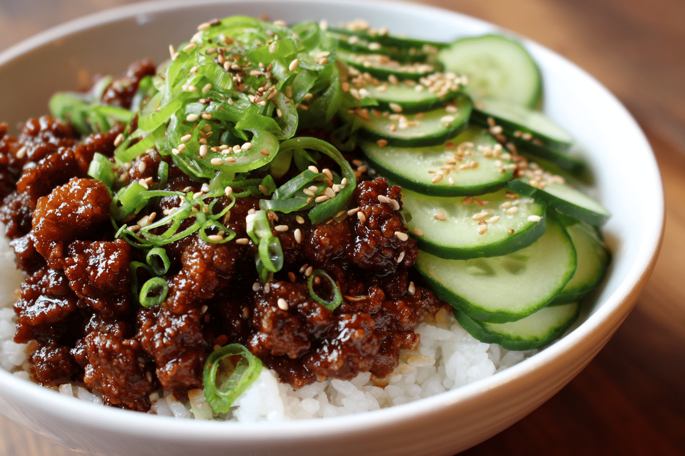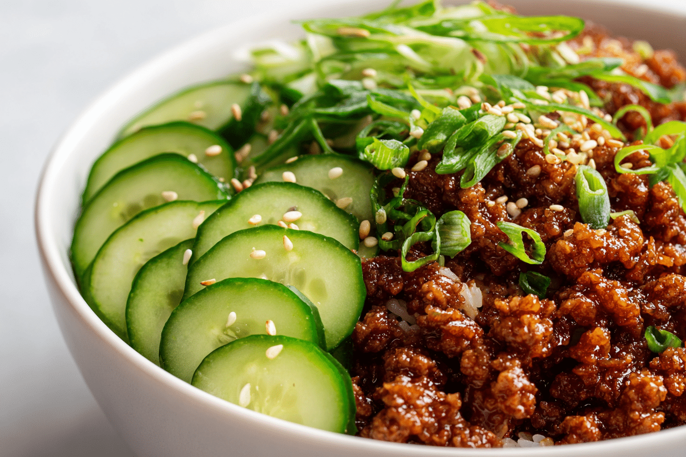 The savory richness of ground beef coated in a glossy, spicy sauce pairs beautifully with the crisp bite of chilled cucumber salad. Each forkful offers contrast: warm and cool, tender and crunchy, savory and lightly tangy. It is a balanced plate that satisfies cravings without heavy carbs.