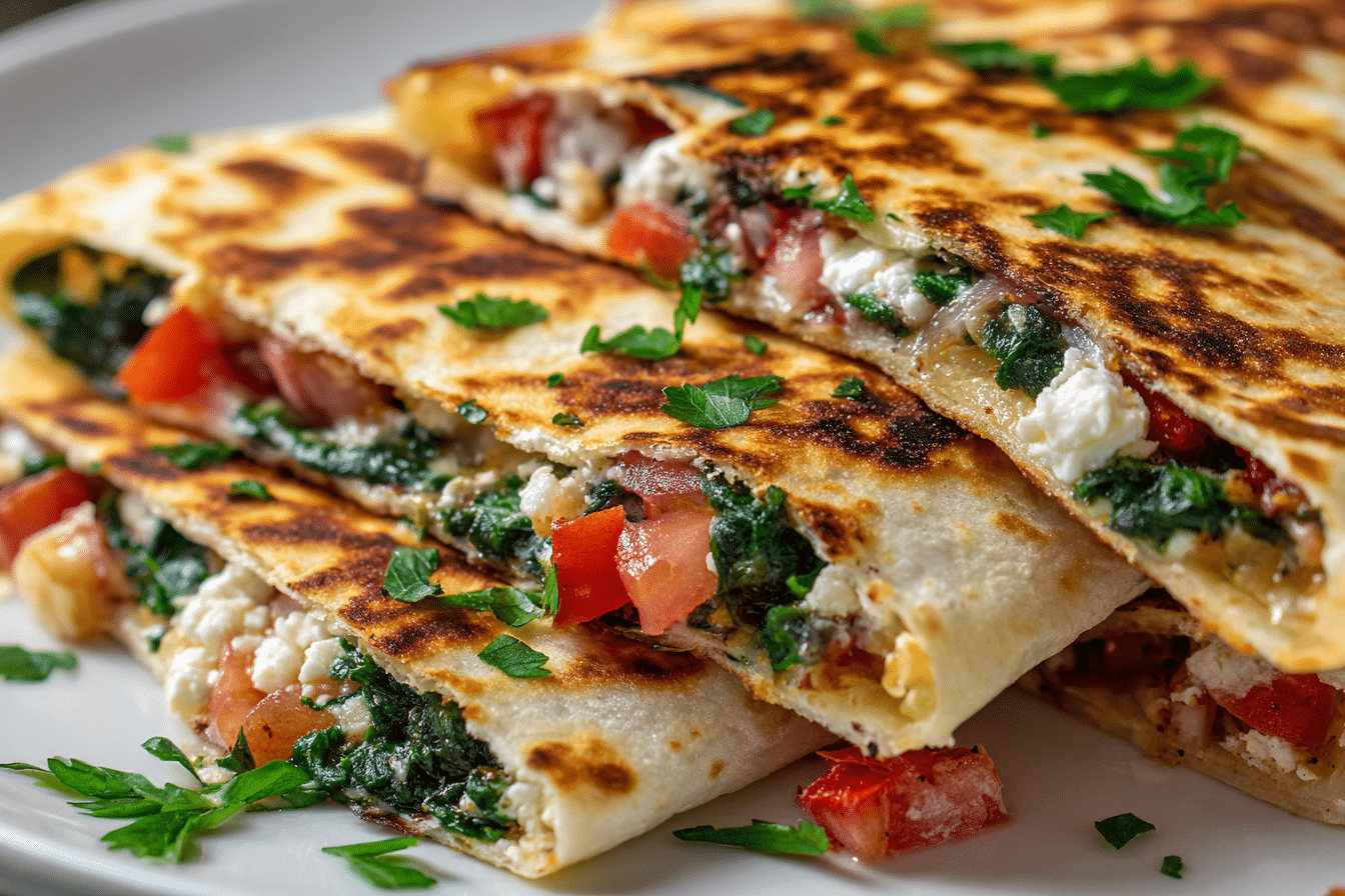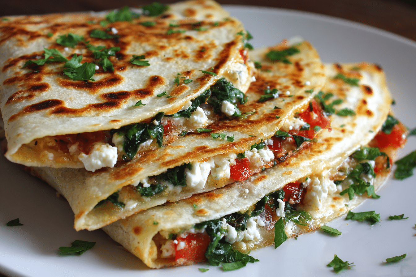Crispy, golden quesadillas filled with sautéed spinach, tangy feta, and melty cheese — a Mediterranean-inspired vegetarian meal ready in 20 minutes.