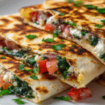 These Spinach and Feta Quesadillas are a delightful Mediterranean twist on a Mexican classic — crispy golden tortillas filled with wilted spinach, crumbled feta, and melty mozzarella or jack cheese. They’re quick, satisfying, and perfect for a light lunch, easy dinner, or appetizer platter.